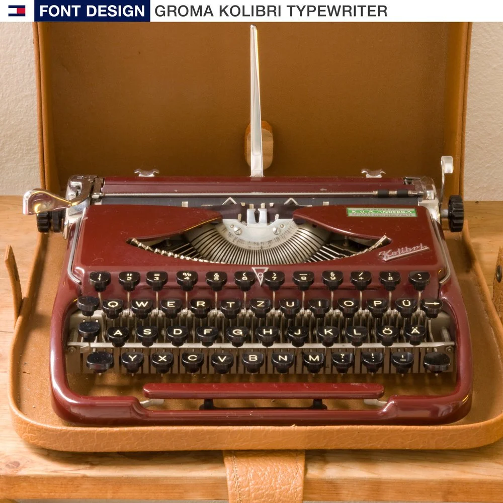 A vintage Groma Kolibri typewriter inside a brown leather carrying case on a wooden surface.