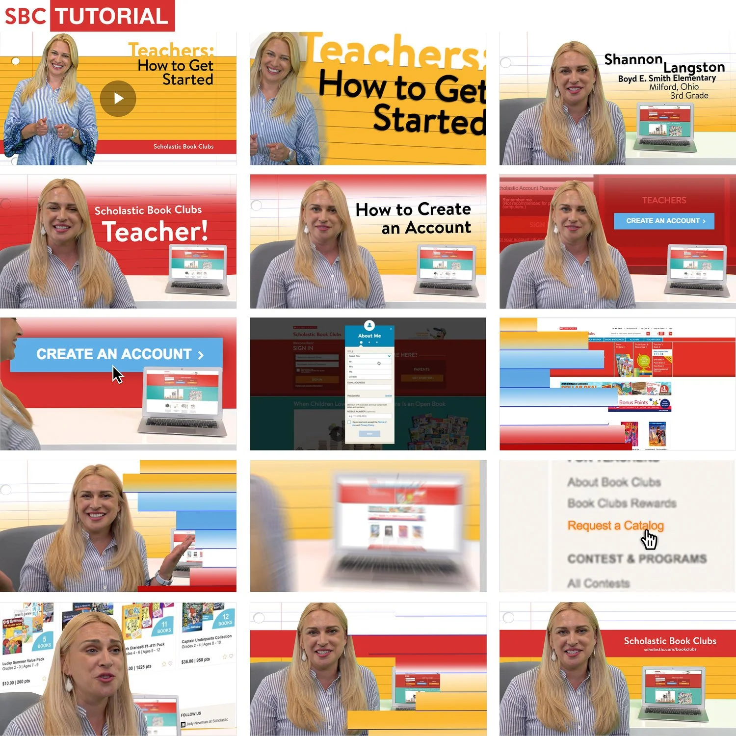 A collage of screenshots from an educational video series about Scholastic Book Clubs, featuring a blonde woman in a blue striped shirt demonstrating how to create an account and request a catalog, with slides showing steps and website interfaces.