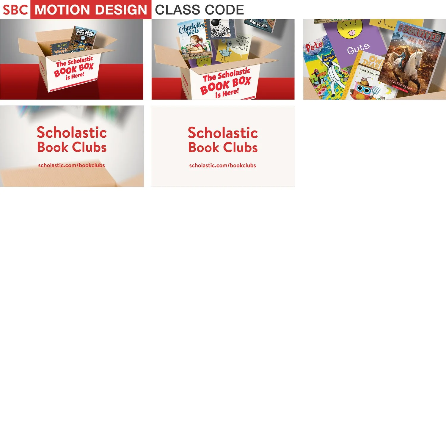 Collection of promotional images for Scholastic book programs including motion design class code, book club advertisements, and pictures of various children's books in boxes and on tables.