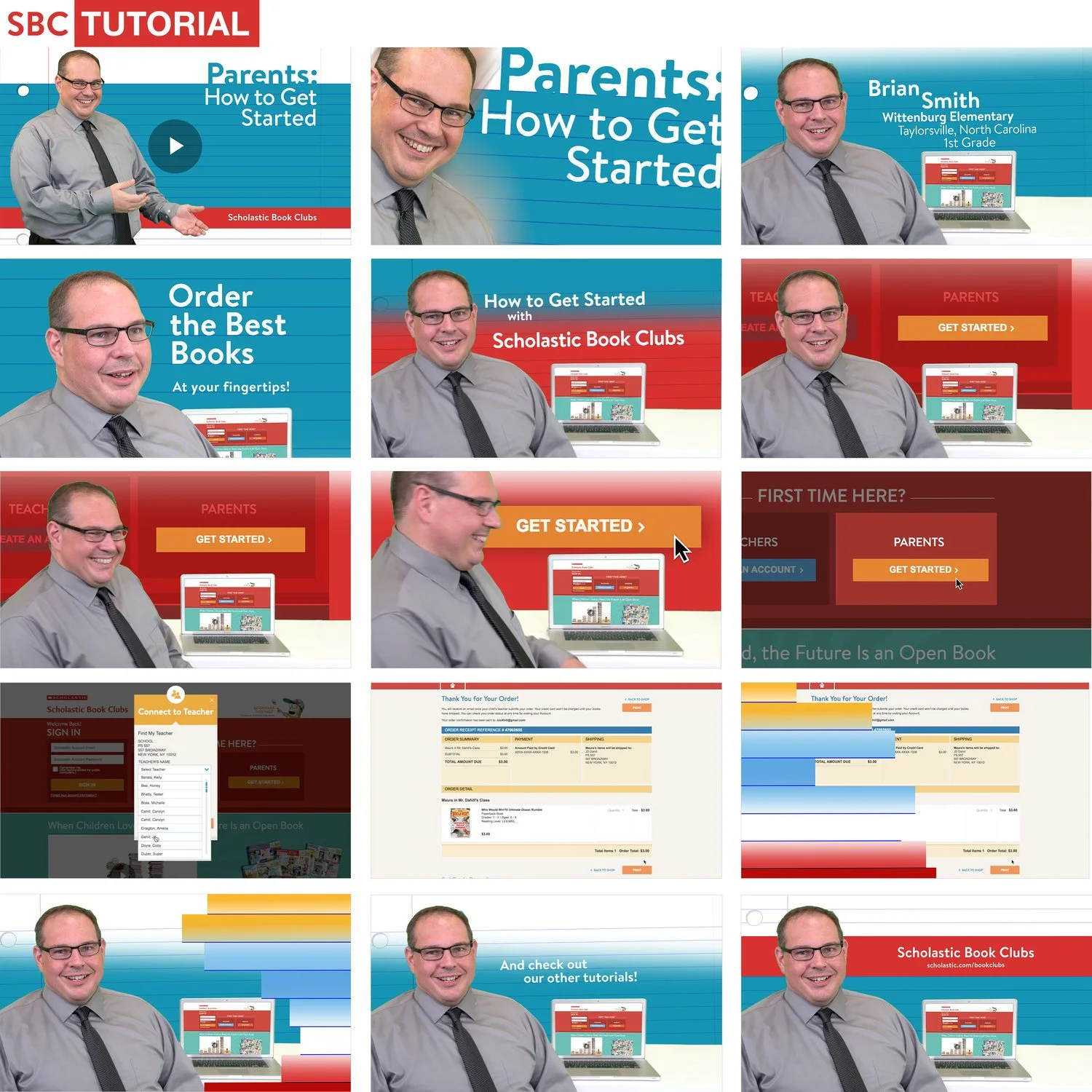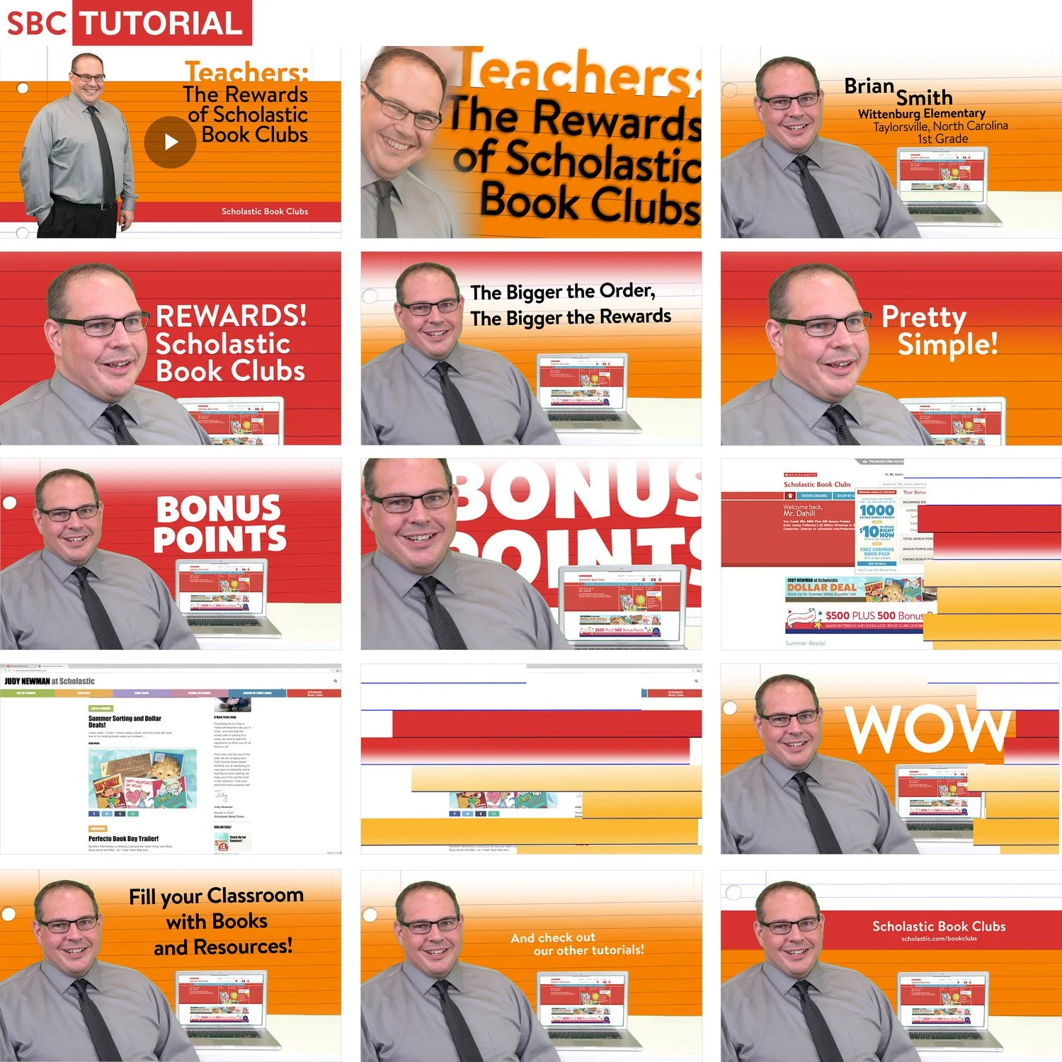 A collage of twelve images promoting Scholastic Book Clubs tutorials featuring a man in glasses and a gray shirt, with slides about rewards, bonus points, and classroom resources, set against red, orange, and yellow backgrounds.