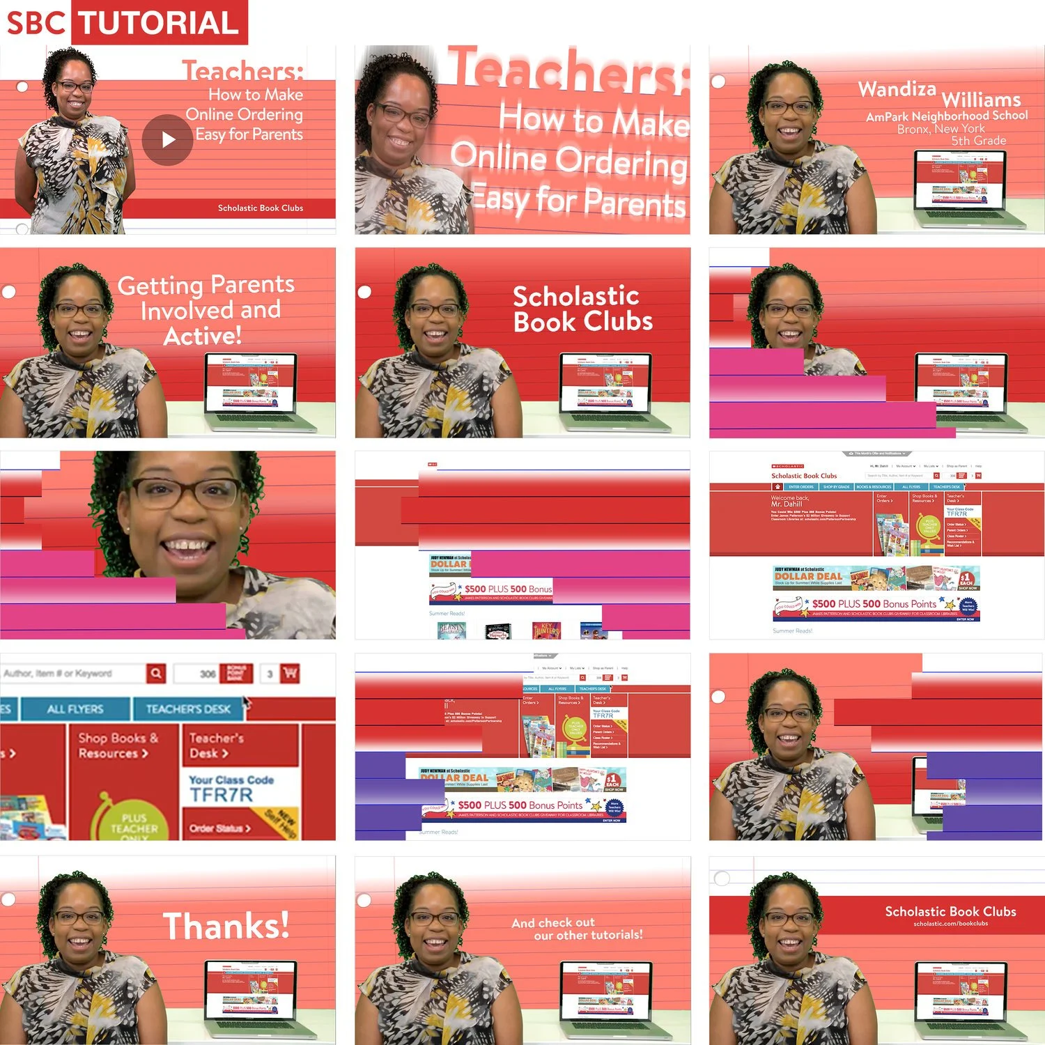 Collage of screenshots from an online tutorial titled 'Teachers: How to Make Online Ordering Easy for Parents,' featuring a woman with glasses and a patterned blouse, promoting Scholastic Book Clubs, with a red and white theme and images of a laptop and website interface.