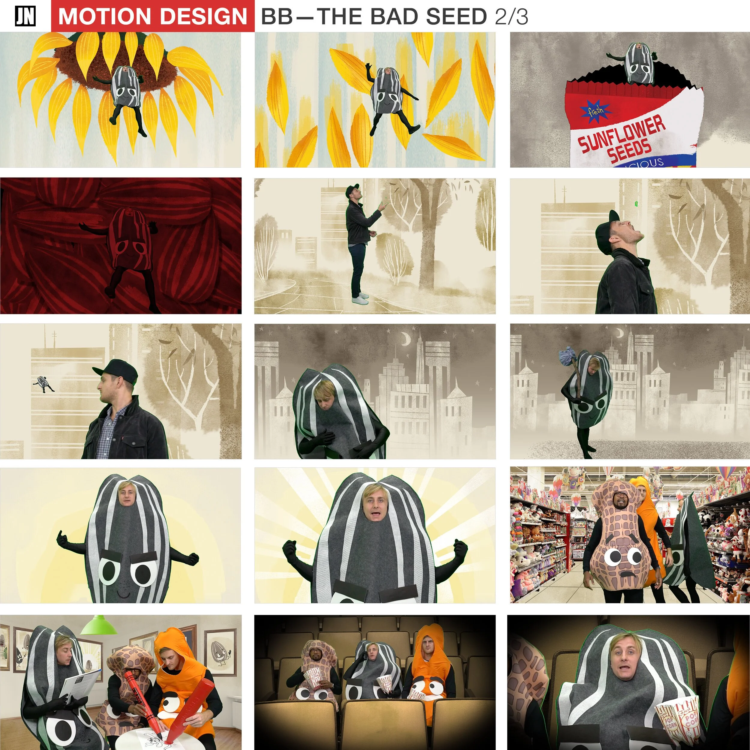 Sequence of images depicting a person dressed as a sunflower seed character in various scenes, including outdoor park and indoor settings, interacting with people, and wearing costume with animated facial expressions, parodying the seed's 'bad seed' personality.