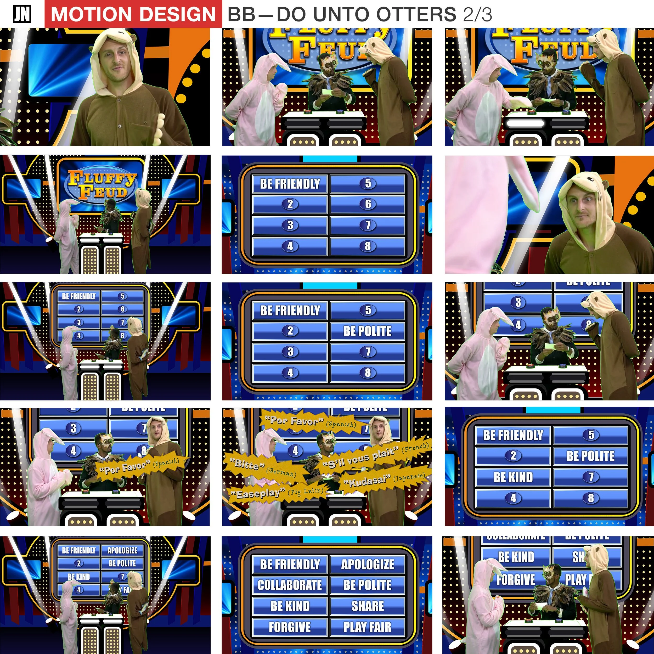 Collage of scenes from a game show called "Fluffy Feud" featuring three contestants dressed in animal costumes: a pink bunny, a black bird, and a person in a dog costume. The show includes questions, multiple-choice answers, and humorous translations of foreign phrases.