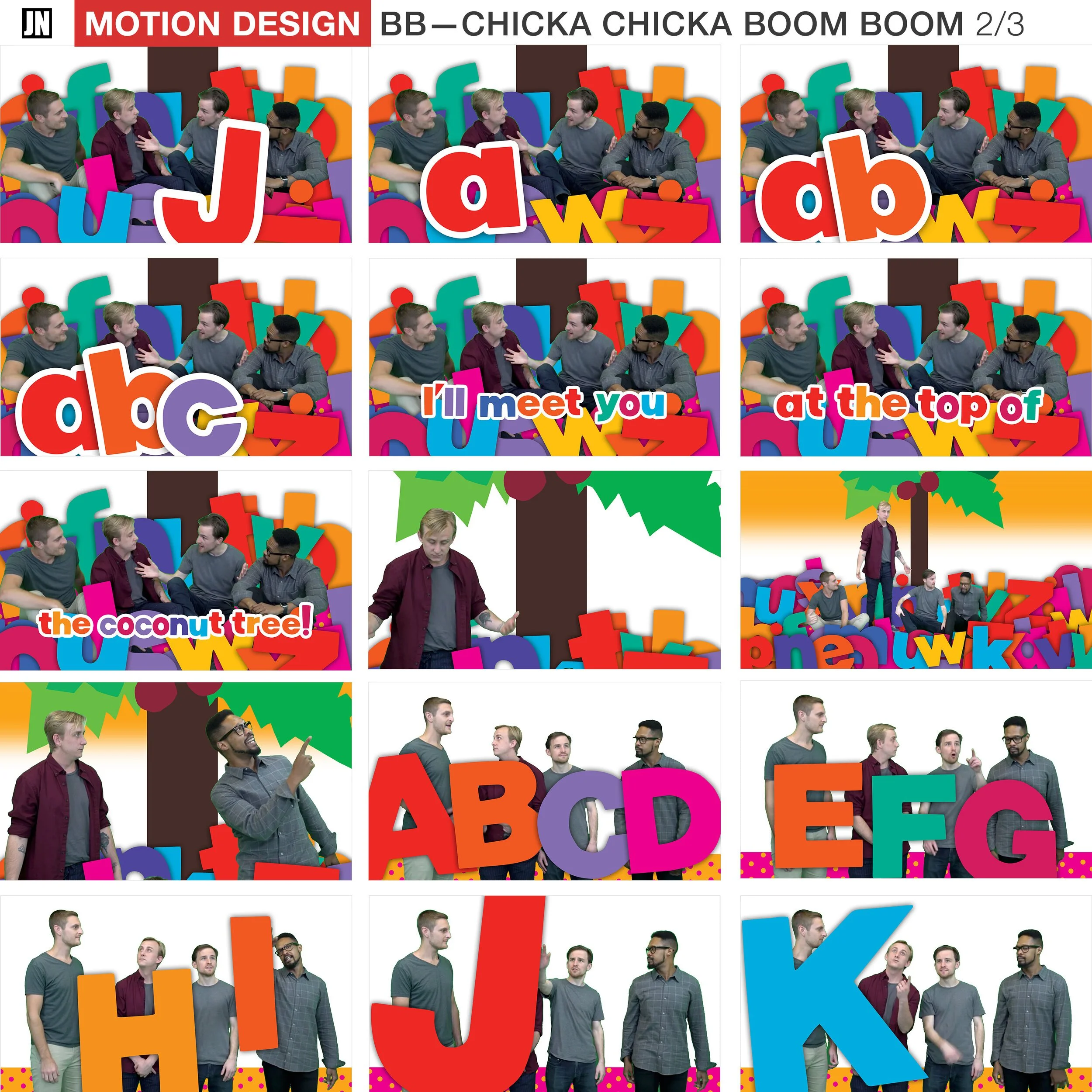 A collage of images featuring the members of the band BB Chic Chicka Boom Boom, with alphabet letters, colorful backgrounds, and playful captions. The band members are seen posing with large, colorful letters and engaging in fun gestures, with a mix of solo, duo, and group shots.