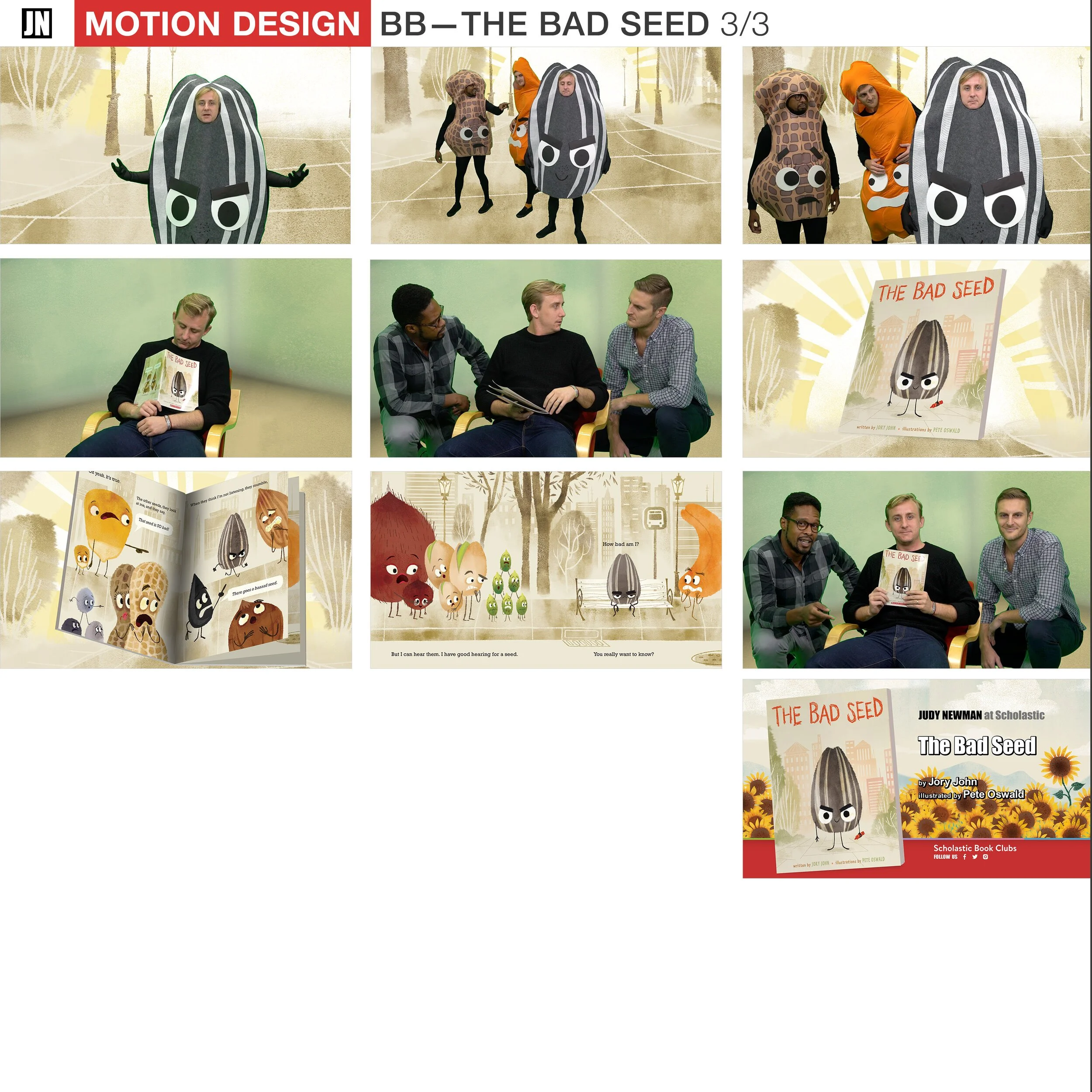 Series of images showing people in costumes of seed characters from 'The Bad Seed' book, reading and discussing the book in a green room and outdoors. Includes book cover illustrations and promotional graphics for the book by Judy Newman with illustrations by Pete Oswald, featuring sunflower backgrounds.