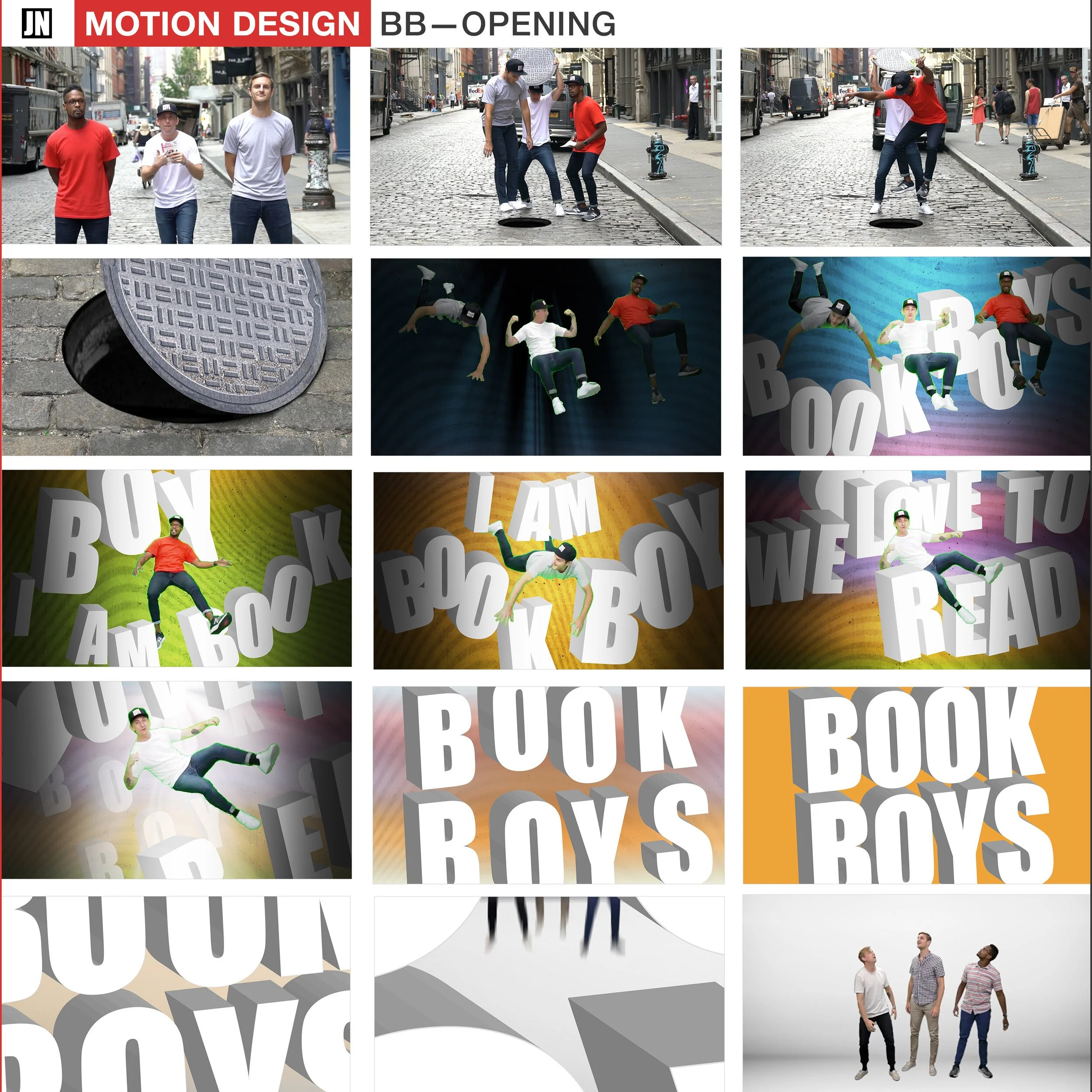 A collage of twelve images: the first row shows people walking and skateboarding on a city street; the second row features a close-up of a manhole cover, and animated people jumping through a digital tunnel; the last rows display animated text saying 'BOOK BOYS' with various backgrounds and a photo of three men standing together.
