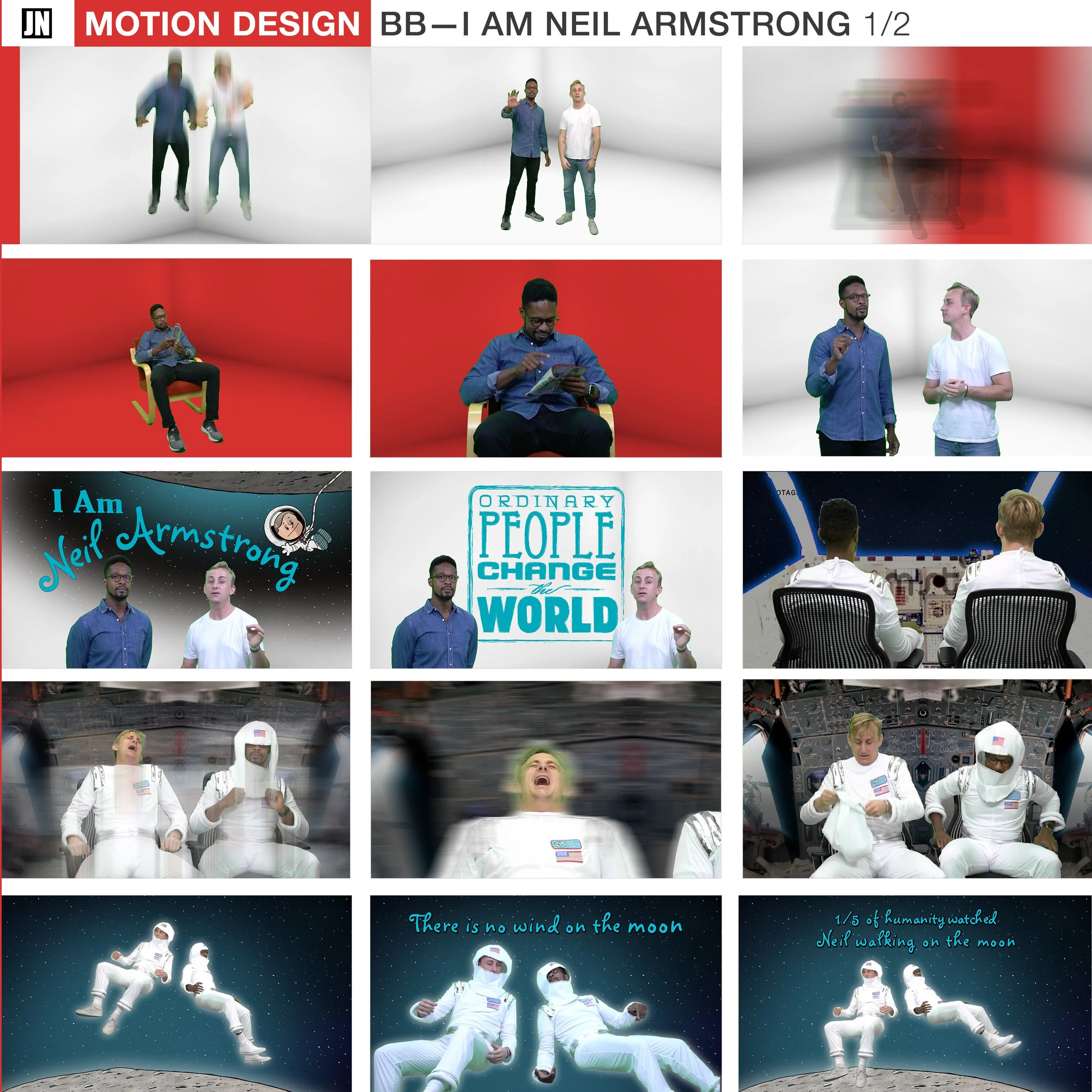 A collage of images centered around Neil Armstrong. It shows people in different backgrounds, including a space-themed scene with astronauts, and images of two men discussing, sitting, and posing. There are also animated space scenes with astronauts in space suits and a quote about Neil Armstrong walking on the moon.